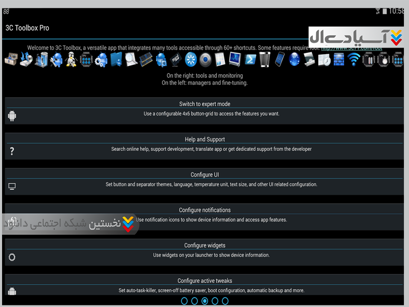 در اختیار داشتن ابزارهای متعدد و پرکاربرد اندرویدی در قالب یک نرم افزار جامع می تواند شما را از دست نصب نرم افزارهای مختلف خلاص کند و علاوه بر آن ، دسترسی سریع به تمامی ابزارها را برای شما فراهم کند. 3C Toolbox از جمله اپلیکیشن های محبوب و قدرتمند می باشد که می تواند به عنوان یک جعبه ابزار کامل بسیاری از نیازهای شما را برطرف کند. شما می توانید توسط این نرم افزار باتری ، سی پی یو ،حافظه ، برنامه ها و فایل های خود را مدیریت کنید ، از بسیاری از محتویات گوشی خود بک آپ بگیرید ، فایل های بی کاربرد را متوقف یا حذف کنید و با در اختیار داشتن بسیاری از ابزارهای دیگر عملکرد گوشی خود را بهبود ببخشید و نیازهای خود را رفع کنید .