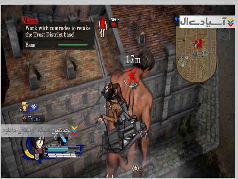 عنوان Attack on Titan که در غرب با نام A.O.T.: Wings of Freedom شناخته می‌شود، عنوانی اکشن هک اسلش می‌باشد که بر پایه سری مانگا‌هایی با همین نام اثر Hajime Isayama توسط استودیو Omega Force ساخته و شرکت Koei Tecmo آن را در سال 2016 برای کنسول‌های PlayStation 3 و Vita و کنسول‌های نسل هشتم و رایانه‌های شخصی عرضه نمود. این عنوان ازلحاظ روایت بر اساس شماره‌های 1 تا 19 این مانگا با سناریویی‌هایی جدید، شخصیت‌های کلیدی جدیدی را وارد داستان می‌نماید. ازلحاظ گرافیکی این بازی همانند انیمه آن بوده و ویژگی‌های مبارزه یک بازیکن با چندین دشمن را دارا می‌باشد. این عنوان دارای 10 شخصیت قابل بازی بوده که در ابتدا فقط سه شخصیت باز بوده و بقیه شخصیت‌ها در طول پیشرفت در حالت داستانی باز می‌شوند.